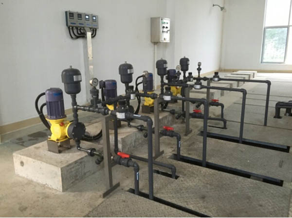 前加氯:源水加氯采用源水流量比例自動投加,即根據流量的變化,按比例地控制加氯量,比例系數的設定根據前加氯量的多少而定,該參數在就地加氯控制面板或上位機電腦上由操作人員根據需要改變比例系數設定值。